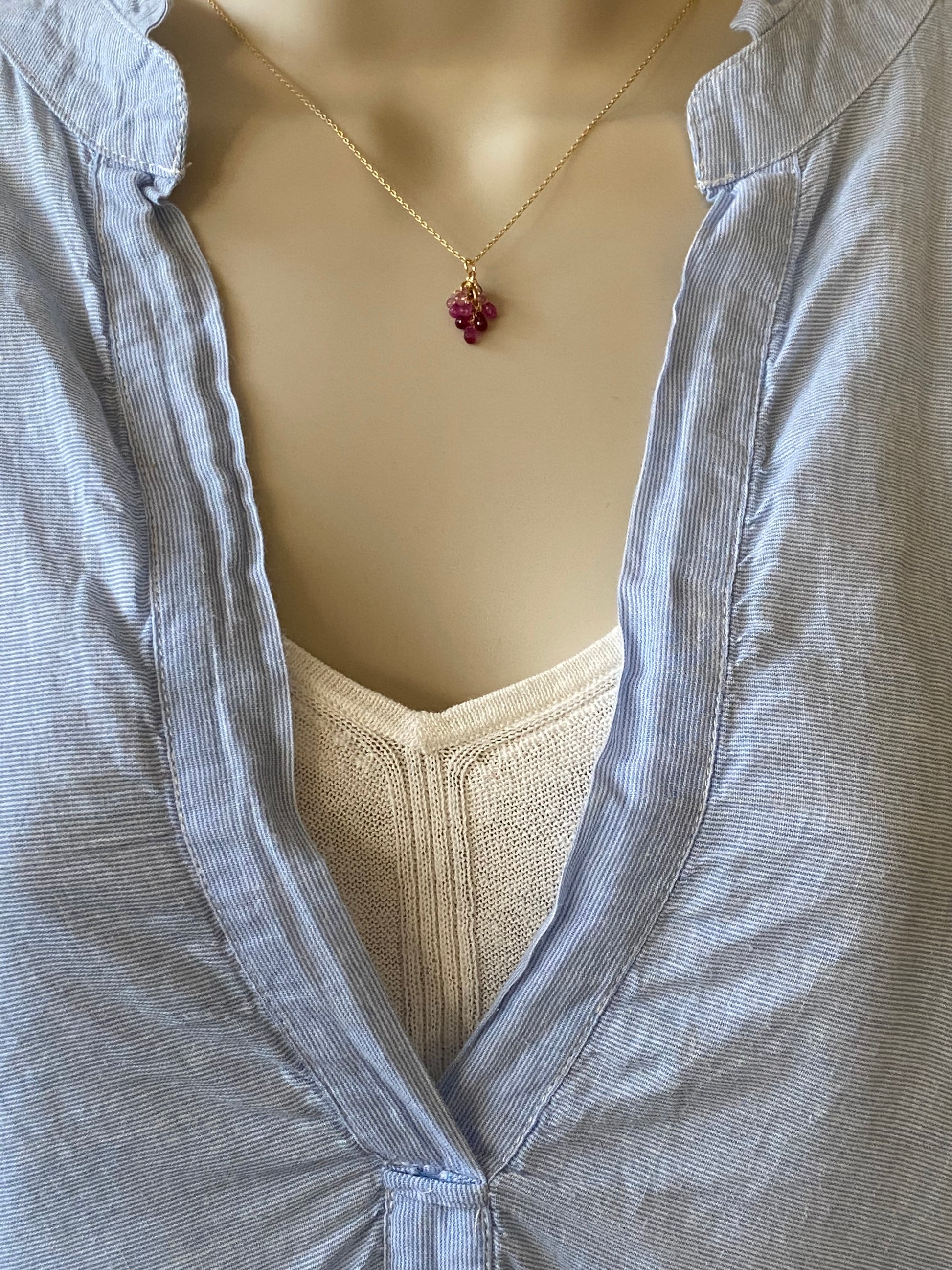 14K gold filled chain. Natural red colour sapphire beads. Nickel free. Suitable for sensitive skin.
