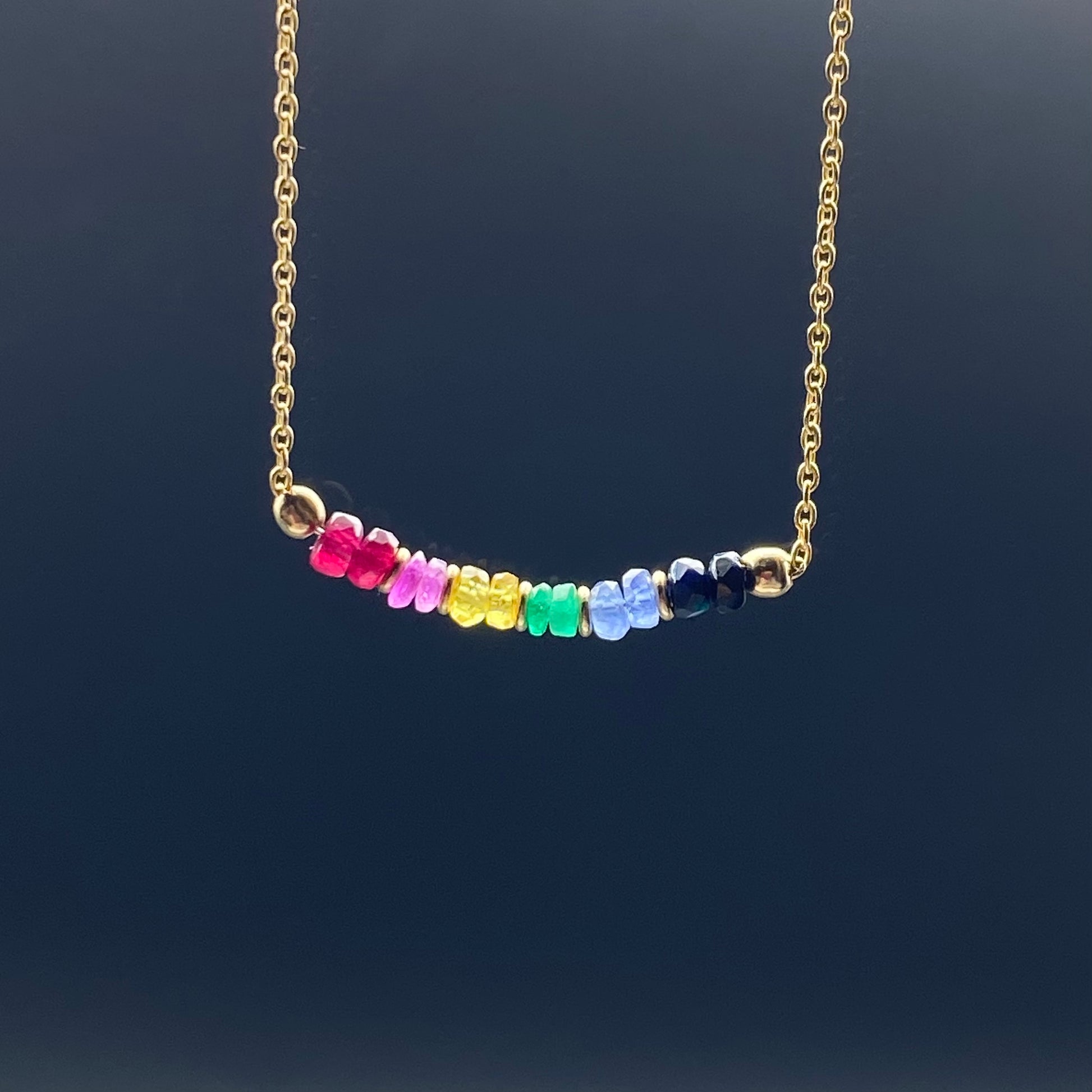Rainbow colours necklace made from natural previous stone blue sapphire, emerald, yellow sapphire and ruby.